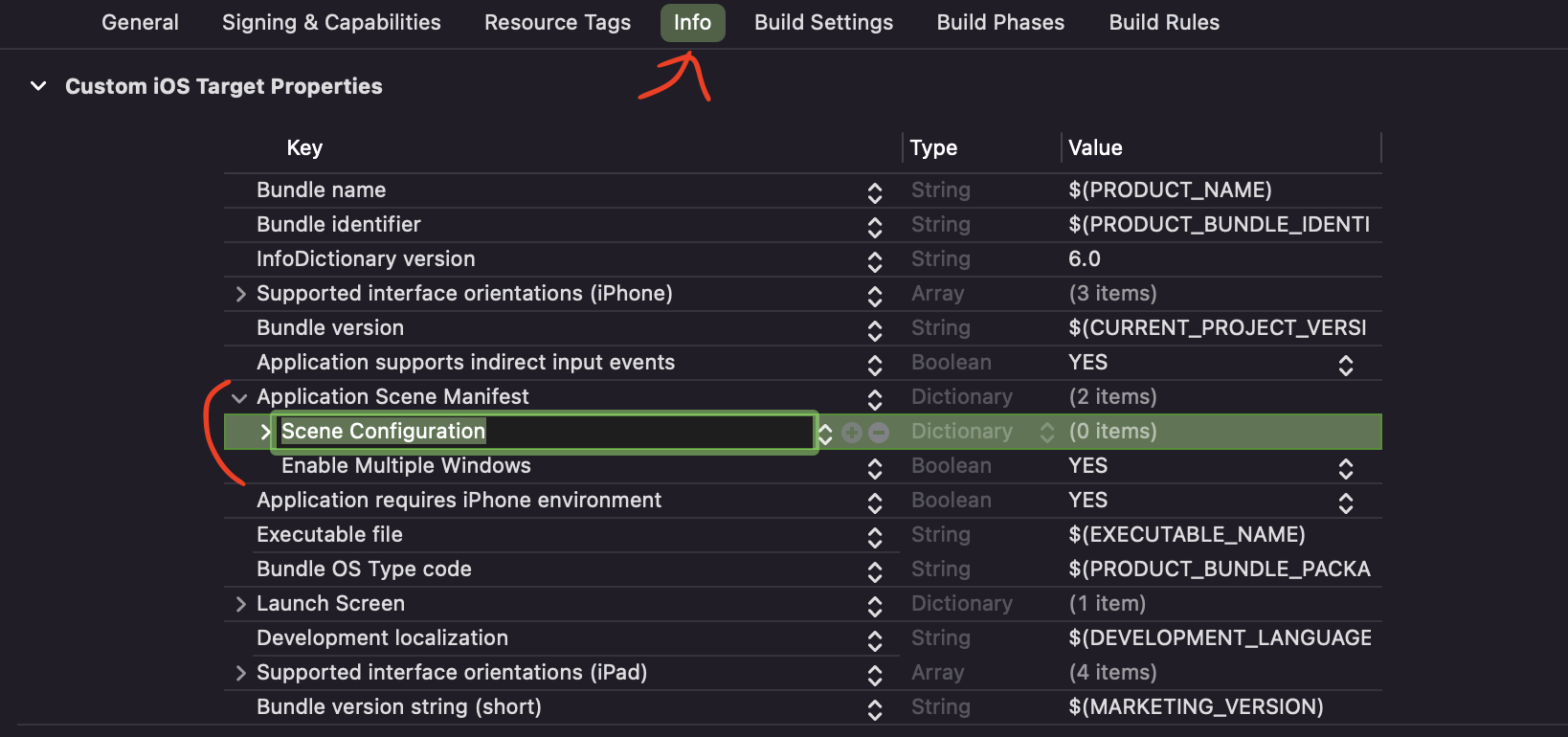 Custom iOS Target Properties > Application Scene Manifest์์ Scene Configuration ์ ์ถ๊ฐํด ์ฃผ๋ฉด ๋จ