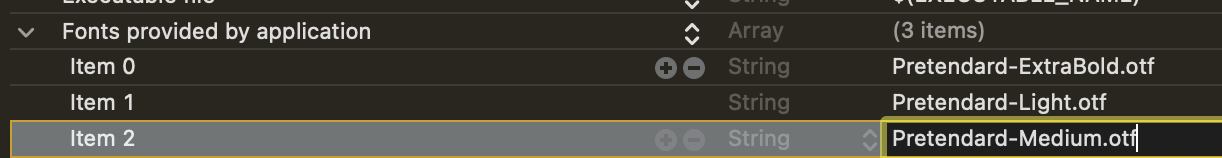 - project > TARGETS > Info ํญ์ผ๋ก ๊ฐ์ "Fonts provided by application" ํ๋๋ฅผ ์์ฑ