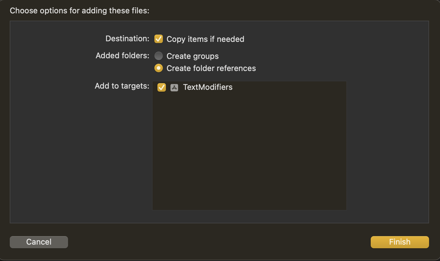 - ์ํฌํธ์์ Copy items if needed ๋ฅผ ์ฒดํฌํด์ ํด๋๋ก ๋ณต์ฌํด์ฃผ๊ณ targets๋ ์ฒดํฌํด์ ์ง์