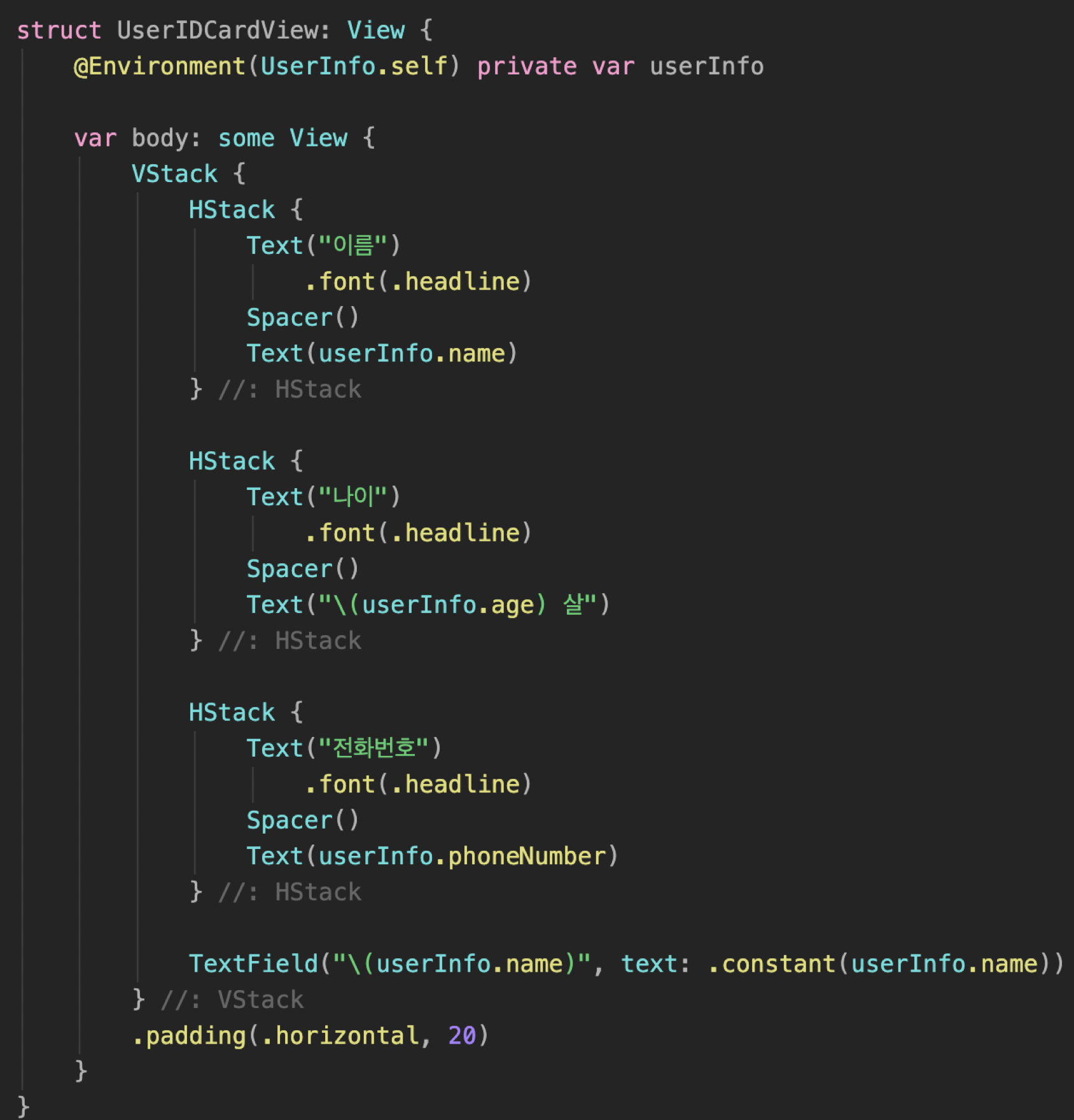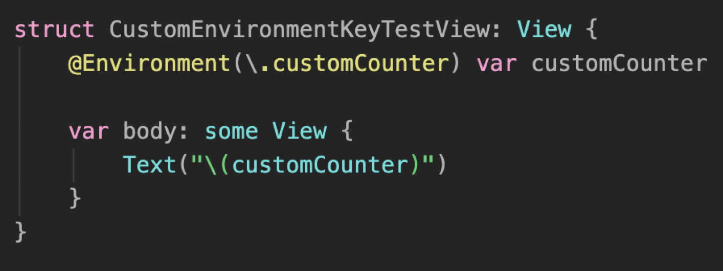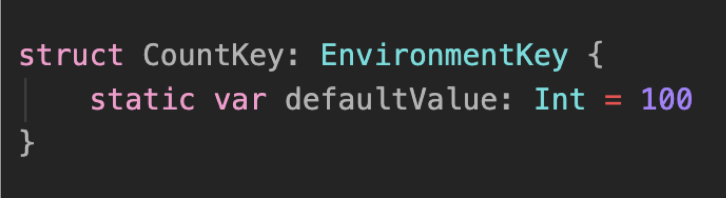 Environment의 키로 사용할 구조체를 하나 정의해 준다. 이때 EnvironmentKey 프로토콜을 채택해야 한다. 이를 채택하면 defaultValue를 꼭 구현해야 한다. 타입과 기본값을 정의해 주어야 한다. EnvironmentObject의 경우 사용할 EnvironmentObject가 뷰 계층에 주입되지 않으면 앱이 크래쉬를 일으키지만 Environment의 경우 주입되지 않은 environment를 사용할 경우 defaultValue값이 나타나게 된다. 따라서 environment를 사용하기 이전에 뷰 계층 구조에 environment가 주입되었는지 확인해야 하며 주입되지 않고 사용하는 경우 뷰 계층 전체에 걸쳐 사용되는 environment가 아닌 기본값일 수도 있음을 주의해야 한다.