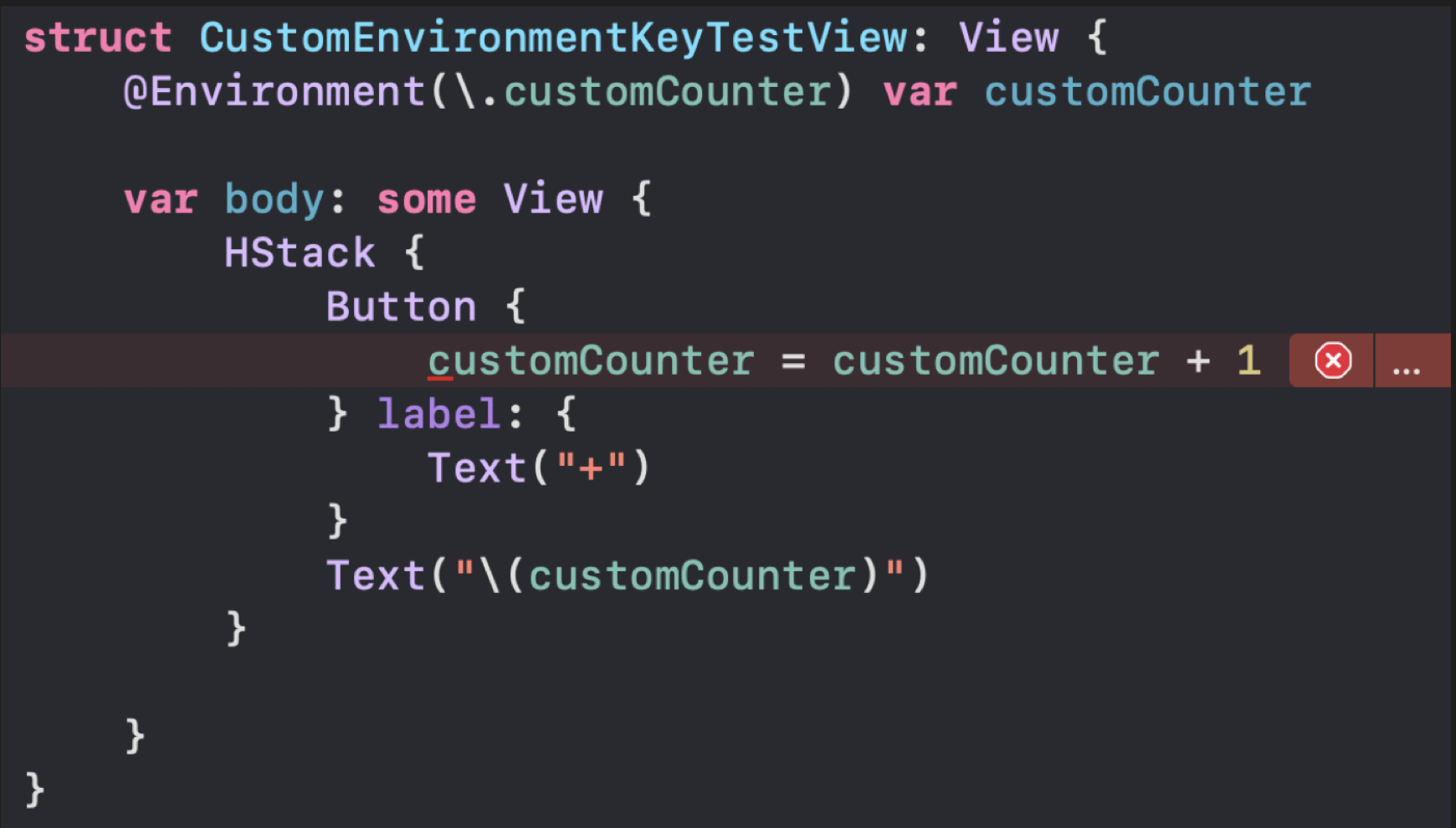 State와 Binding과는 다르게 environment property는 view 내부에서 변경할 수 없는 get-only property로 지정되어 있다.