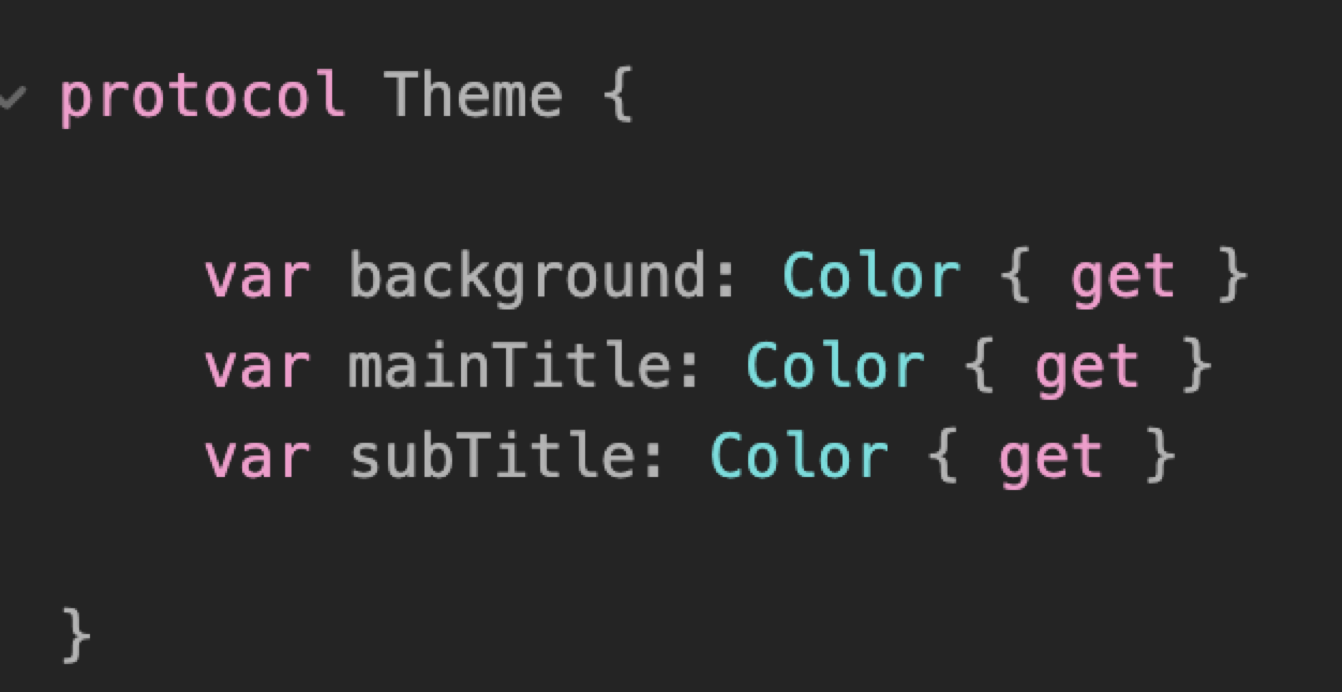 Theme 프로토콜을 정의해 준다. 앱 내부에서 사용할 컬러값을 작성해 준다.