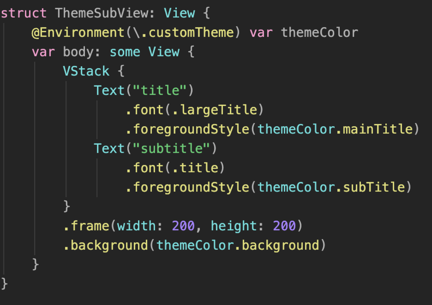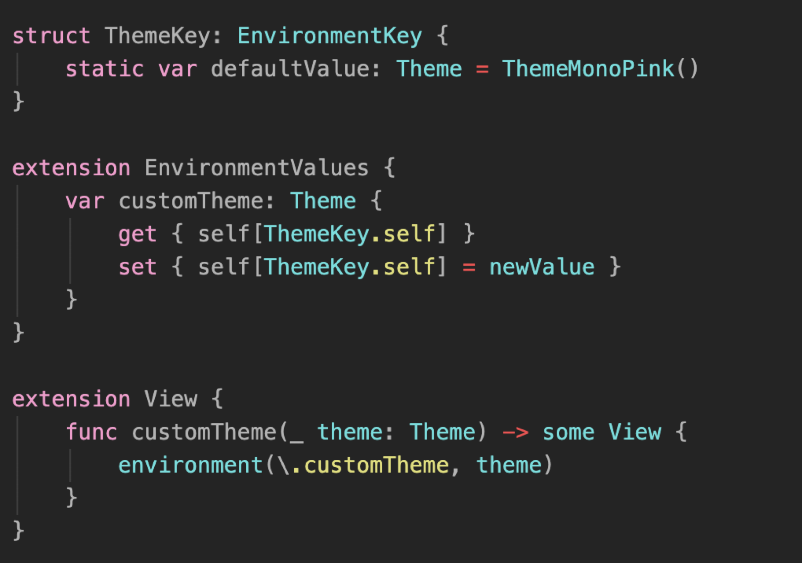 Theme 타입으로 custom environment를 생성해준다. View의 extension에 함수를 정의해서 사용하면 keypath 부분을 가릴 수 있어 더 깔끔하고 직관적인 이름으로 코드를 작성해 줄 수 있다.