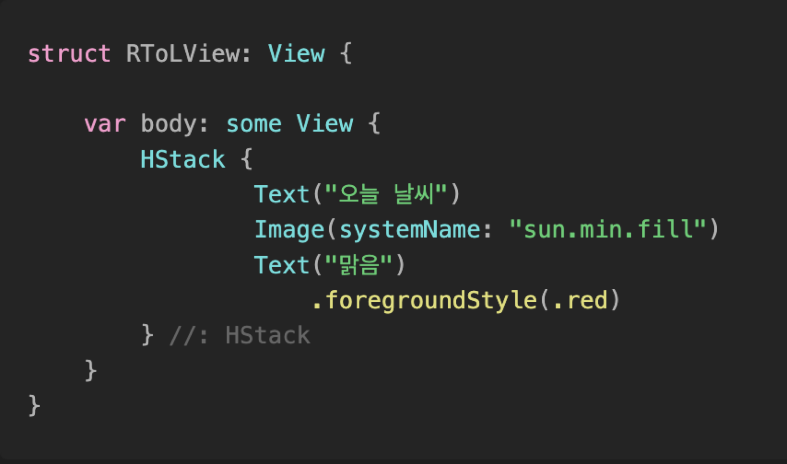 RToLView라고 하는 View에는 Text, Image, Text를 감싼 HStack이 정의되어 있다.
