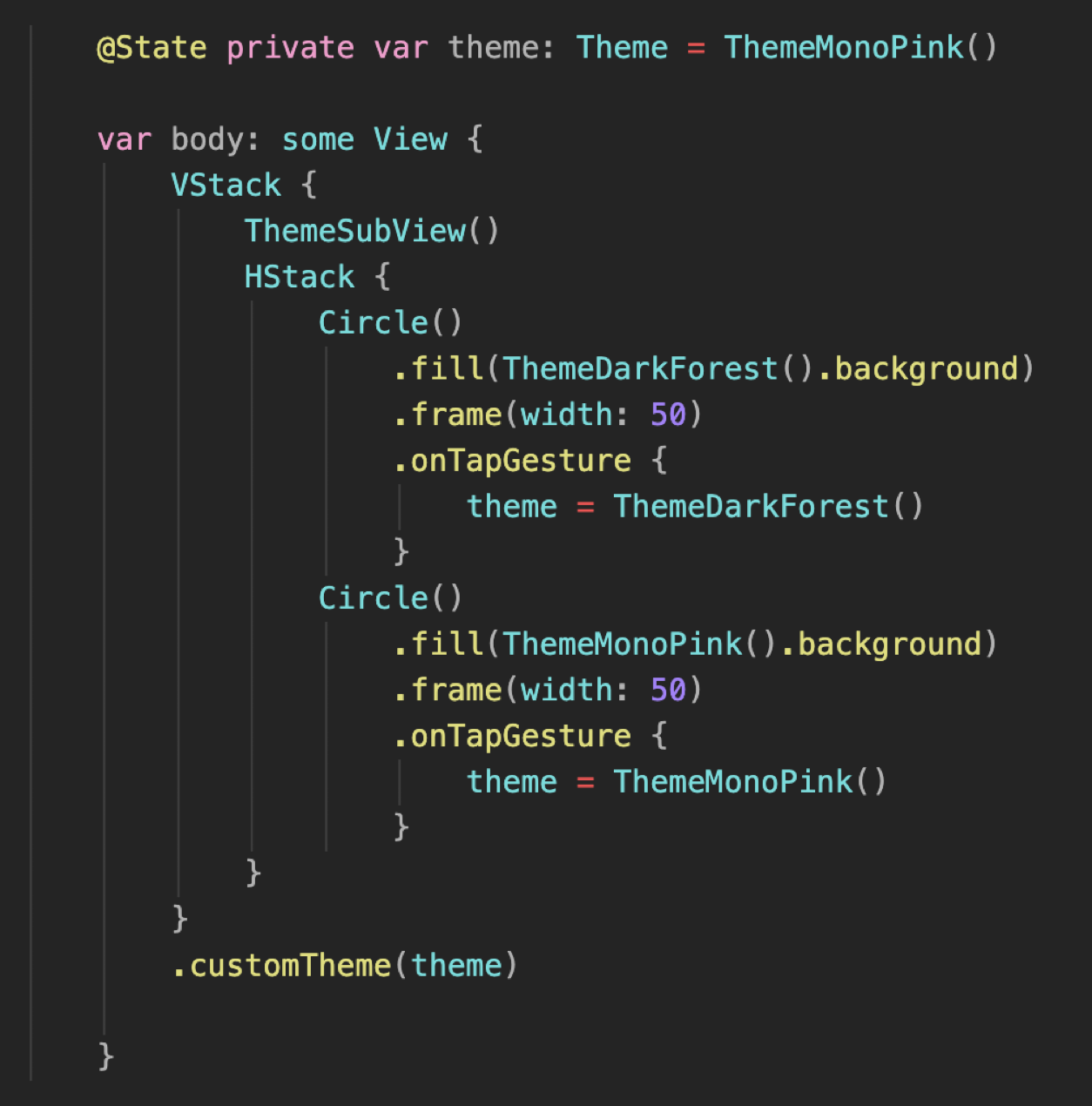 State로 변경가능한 값인 theme을 설정하고 onTapGesture을 사용해 이 값을 변경한다. 그리고 이 값을 environment로 주입하면 하위 뷰에서 이 테마 값을 공유할 수 있다.