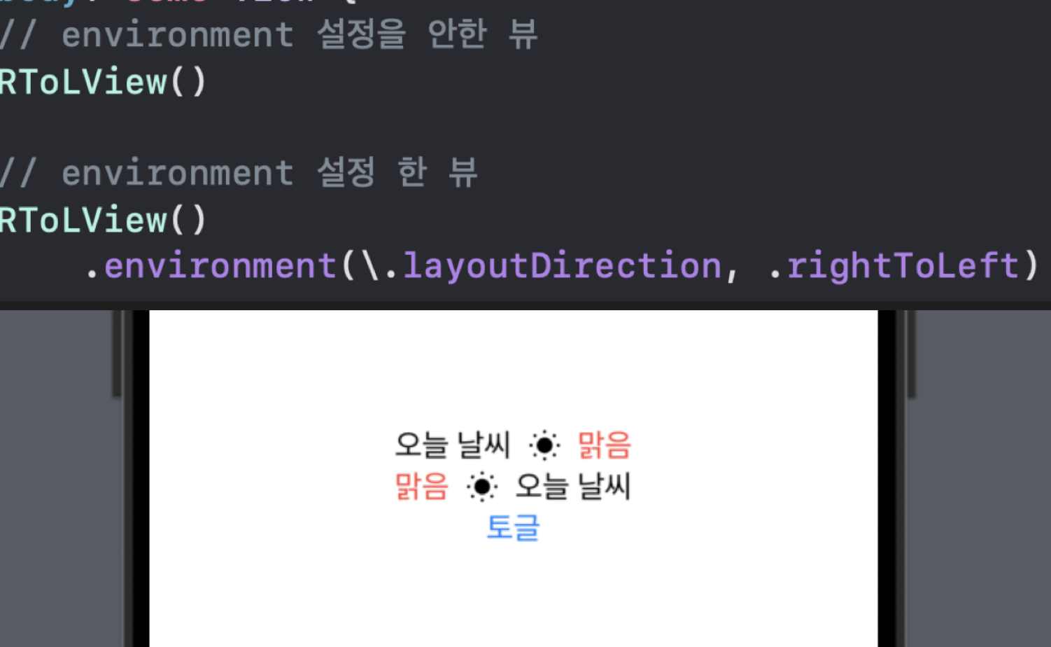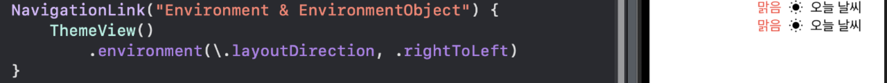 ThemeView에는 environment값을 주입하지 않은 RToLView를 두 개 넣어주었고 상위 뷰인 ThemeView에 environment를 주입하는 경우 하위 뷰 모두 environment값에 따라 뷰의 순서가 변경된 것을 확인할 수 있다.