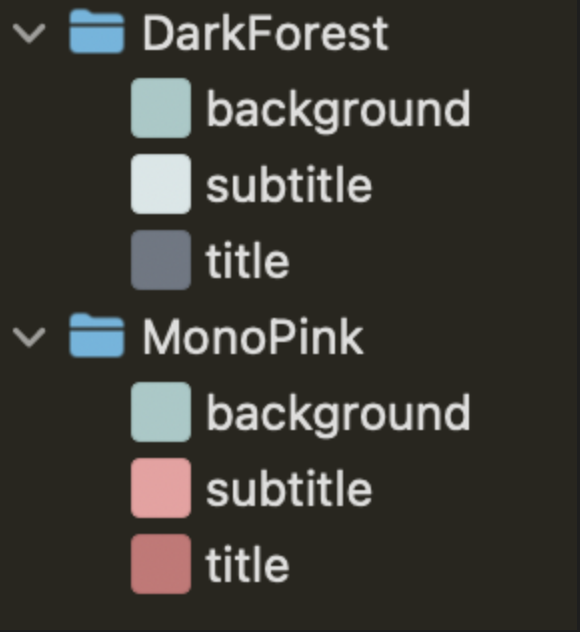 Asset에 테마별로 컬러를 지정해 준다. 이때 컬러는 Theme 프로토콜에서 작성한 색상 이름을 사용했다.