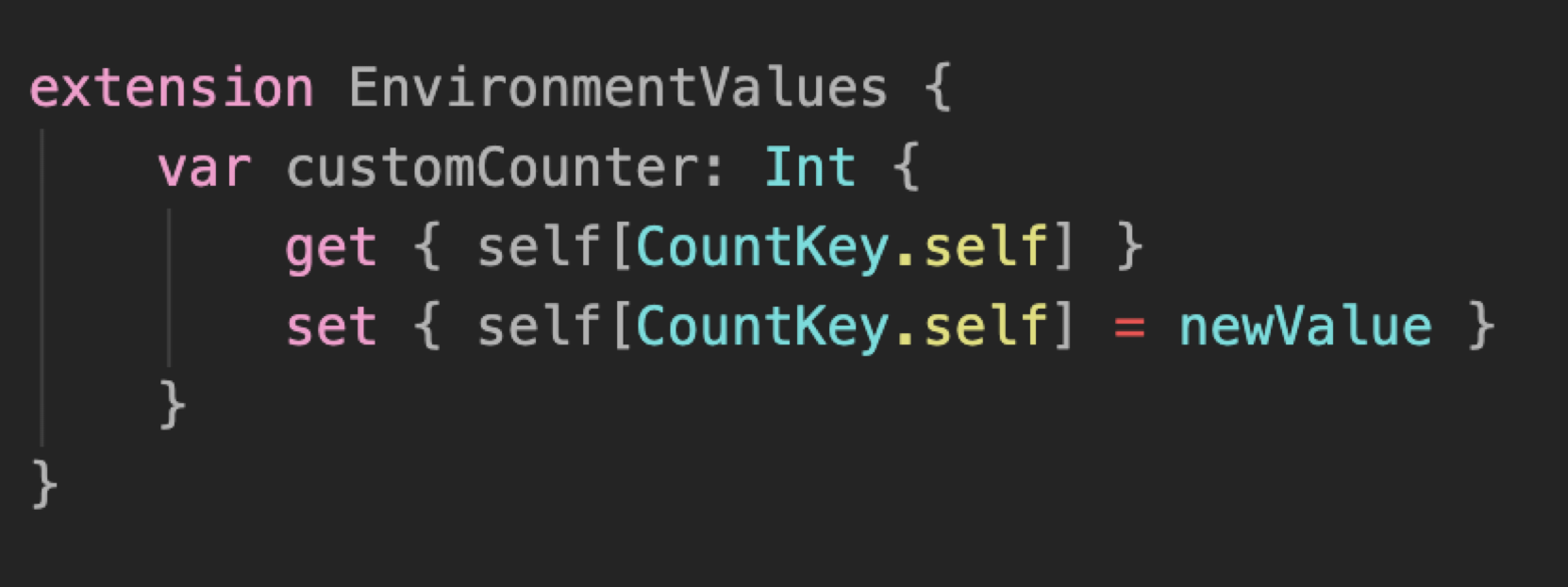 EnvironmentValues의 extension에 프로퍼티를 정의해 준다. 이 프로퍼티가 키패스로 사용된다. EnvironmentValues의 CustomKey로 getter와 setter를 지정해 준다.