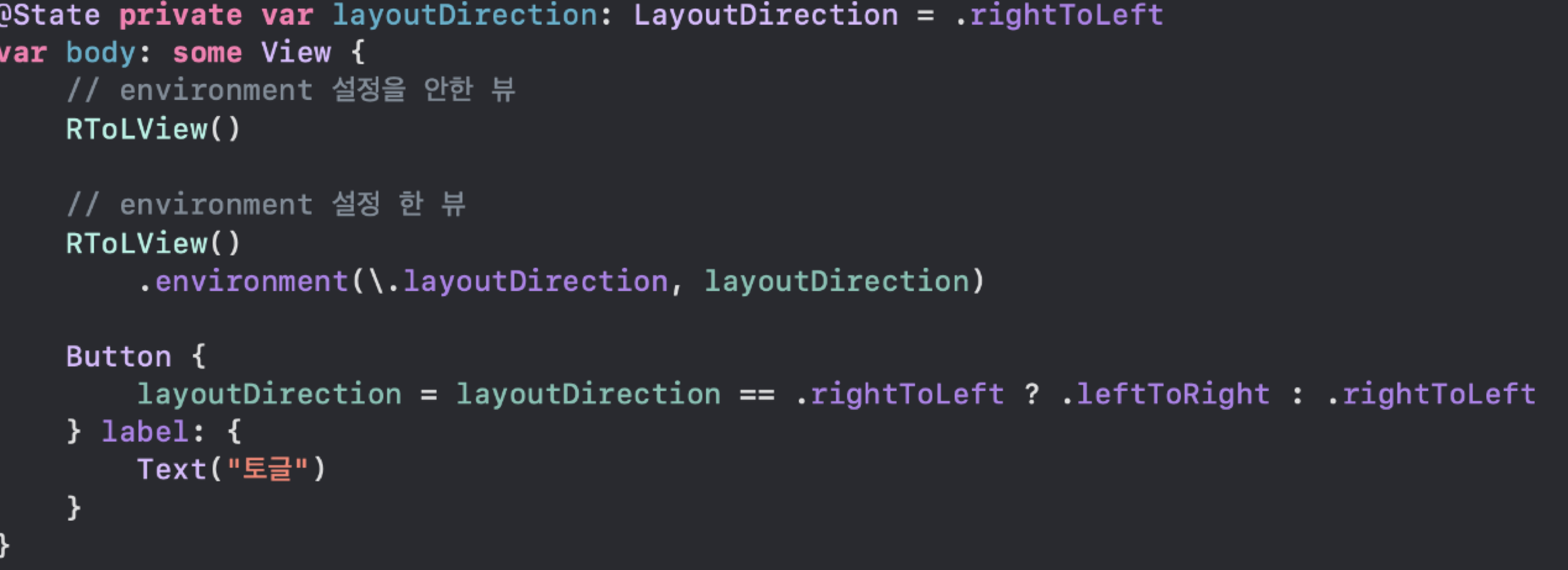 environmet로 주입할 값을 State로 선언해 준 뒤 environment modifier을 사용해서 값을 주입해 주면 된다. 위의 코드에서는 버튼을 누를 때마다 environment modifier로 주입할 값인 layoutDirection이 변경되는 것을 확인할 수 있다.