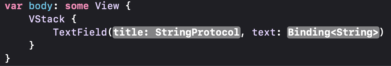 - TextField์ ๊ฒฝ์ฐ text๋ผ๋ ์ธ์์ ํ์ํ ๊ฐ์ด Binding